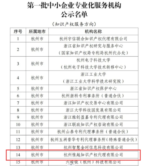 喜報(bào)!!關(guān)于杭州惟越知識(shí)產(chǎn)權(quán)代理有限公司入選浙江省首批中小企業(yè)專(zhuān)業(yè)化服務(wù)機(jī)構(gòu)的公示